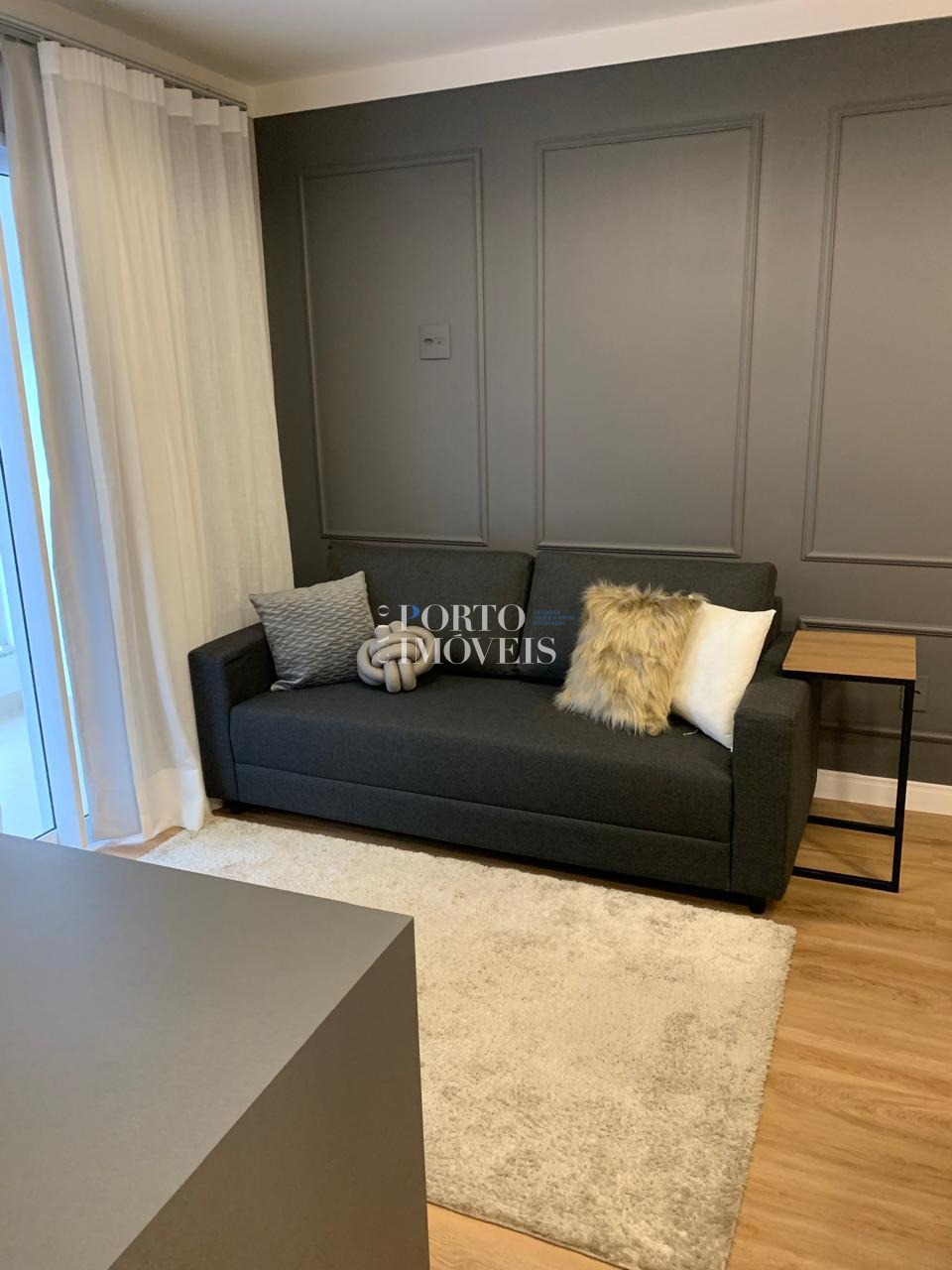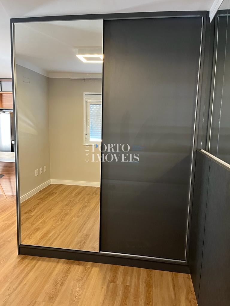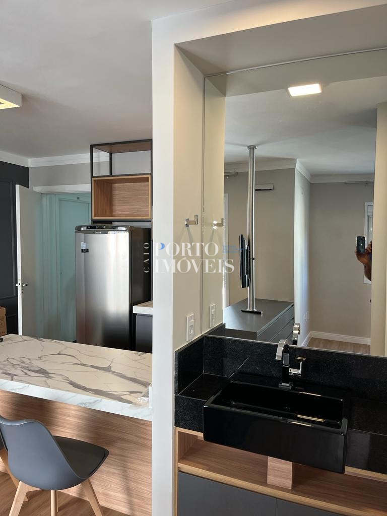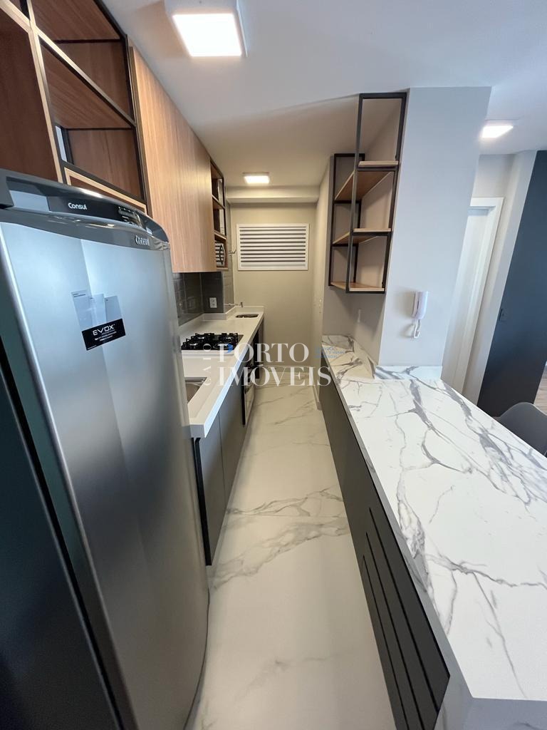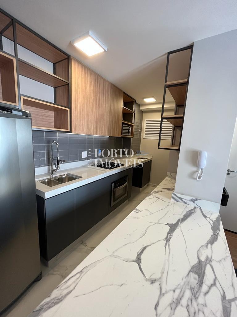 O apartamento possui planta inteligente e ambientes integrados, com sala aconchegante, cozinha funcional, varanda que garante boa iluminação natural e área de descanso bem distribuída. A unidade está mobiliada, com armários planejados e mobiliário de sala e cozinha, faltando apenas a cama — perfeito para personalização do morador ou rápida preparação para locação.